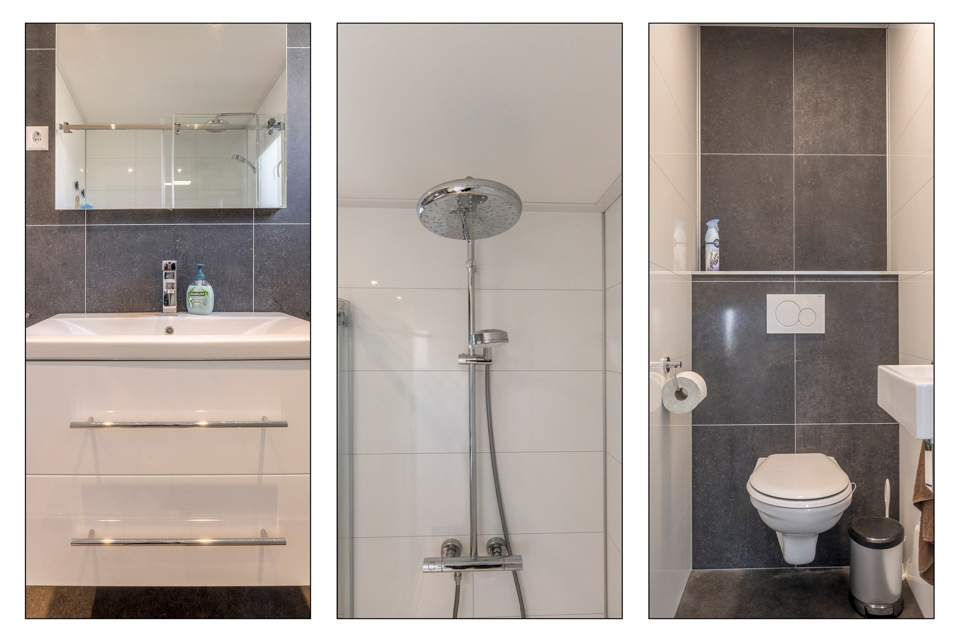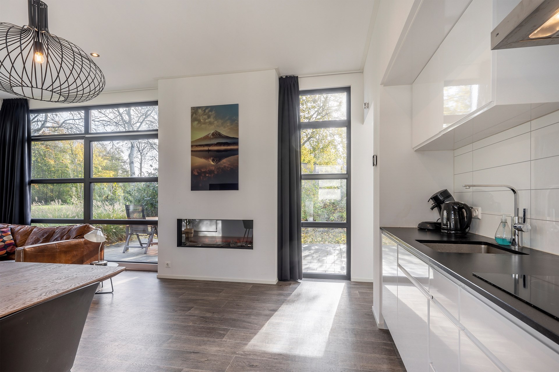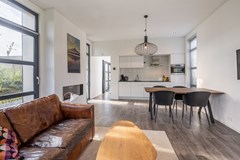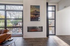 Entree, hal, ruime en lichte woonkamer met open haard, zwevend toilet met fonteintje, slaapkamer 1, badkamer met regen en handdouche, wastafelmeubel en